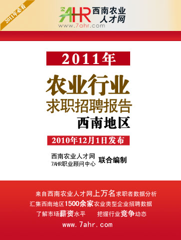 2009年12月8日起,西南农业人才网独家发布了《2009西南地区农业领域招聘求职报告暨2010招聘求职展望》(简称7ahr西南区农业2010求职招聘报告),报告一发布,就受到了企业及求职者的大力好评。 2010年12月1日起,7AHR职业顾问中心经过对上万名求职者的求职期望分析,通过对上千家西南地区农业类型企业的招聘数据统计与调查,《2011西南地区农业领域招聘求职报告》将续录在西南农业人才网上发布。