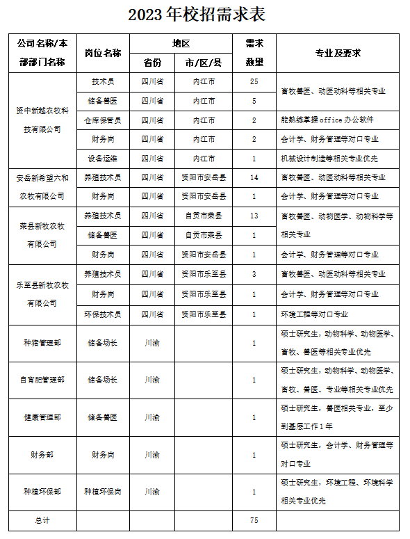 成都天府兴新鑫农牧科技有限公司2023年招聘高校毕业生工作已全面启动,欢迎应届高校毕业生应聘我公司。现将有关事宜公告如下。