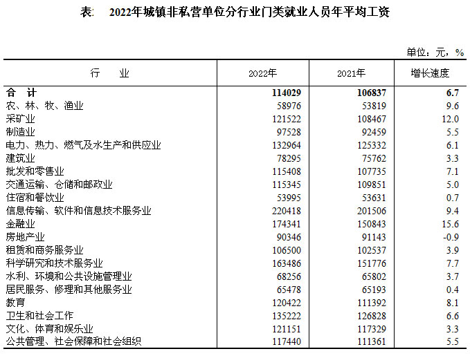 2022年全国城镇非私营单位就业人员年平均工资为114029元,比上年增加7192元,名义增长6.7%。扣除价格因素,2022年全国城镇非私营单位就业人员年平均工资实际增长4.6%。