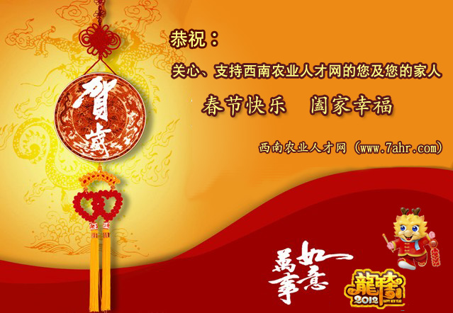 您们好!龙年新春佳节即将来到,新春新景。7AHR与大家一起又将迎来新的一年,在这迎新之际,西南农业人才网(www.7ahr.com)祝您龙年快乐,新春吉祥。