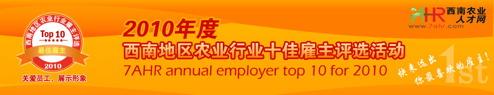 为了让更多的人才了解西南地区农业行业的企业,进一步促进农业行业的快速发展,作为西南地区首家专业农业人才网7AHR特倡导并主办此次活动。其成果将为参与者及广大的企业管理者提供更明确的市场基准,通过对员工忠诚敬业度和员工创造价值能力,引导企业正确评估人才价值与企业绩效,以此正确示范人力资源管理的科学发展。 评选结果已发布,参见>>2010年西南地区农业行业十佳雇主企业名单 |
